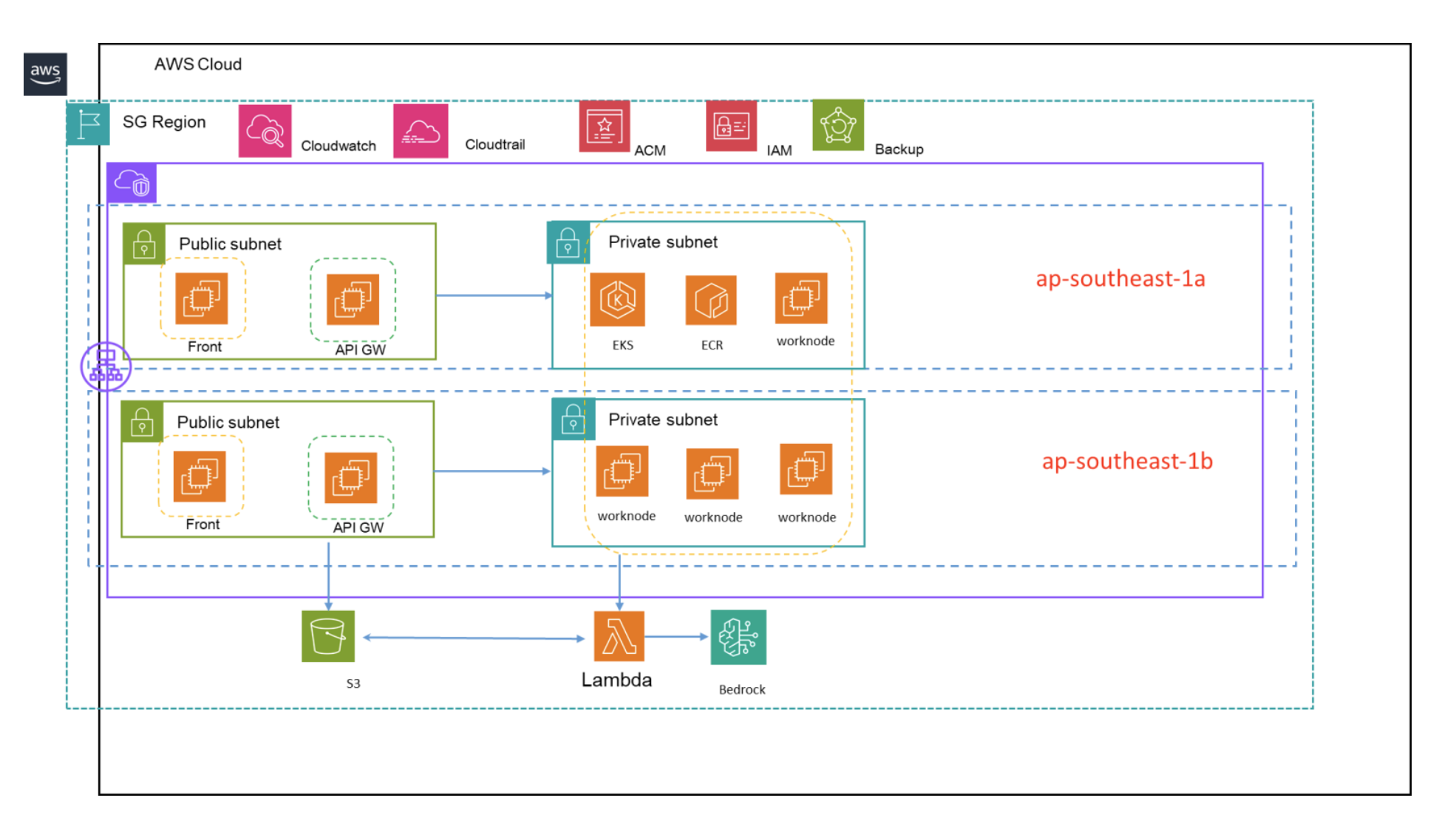 Backend: Core game logic and physics engines run on Amazon EKS clusters across multiple availability zones. Auto Scaling and ELB load balancing handle traffic peaks, ensuring stable low-latency gameplay.